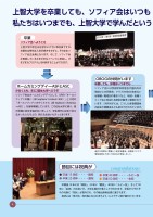 創立100周年に開催した記念演奏会。合唱系クラブや管弦楽団など多くのOBOGが参加しました。 卒業後15年には「銅祝」、25年に「銀祝」、40年に「ルビー祝」、そして50年に「金祝」のお祝いが、大学主催の行事として行われます。学長からそれぞれの代表に「祝状」が授与され、その後出席者全員に渡されます。 祝状には「世の光、地の塩となられますよう」にとラテン語で書かれています。● 卒業15周年・・・・銅祝● 卒業25周年・・・・銀祝上智大学を卒業しても、ソフィア会はいつも私たちはいつまでも、上智大学で学んだという● 卒業40周年・・・・ルビー祝● 卒業50周年・・・・金祝 卒業ソフィア会へようこそ上智大学の学生は在学中にすでに準会員ですが、卒業生は特別な入会手続きをせずに、そのままソフィア会正会員となります。そして、ソフィア会が用意しているさまざまなイベントに参加し、さまざまなプログラムを利用することができます。 ホームカミングデイーASFとASC少なくとも、年に2回は大学へどうぞソフィア会はホームカミングデイとして、5月の「オールソフィアンの集い(All Sophians’ Festival=ASF)」と12月の「オールソフィアンのクリスマス(All Sophians’ Christmas=ASC)」を毎年開催しています。この日は大学に帰り、昔の仲間と旧交を温め合いましょう。学生時代には知り合えなかった人たちとの、新たな出会いもきっとあります。 OBOGの仲間がいます卒業しても、仲間はいつまでもソフィア会には学部学科同窓会や国内外の地域ごとの同窓会、クラブのOBOG会あるいは職種・職域別の集まりなど、地域・各種ソフィア会と呼ばれる団体が数多く登録されています。5月のASFには、こうした各登録団体の総会や懇親会なども併せて行われています。congratulations節目には祝典が4