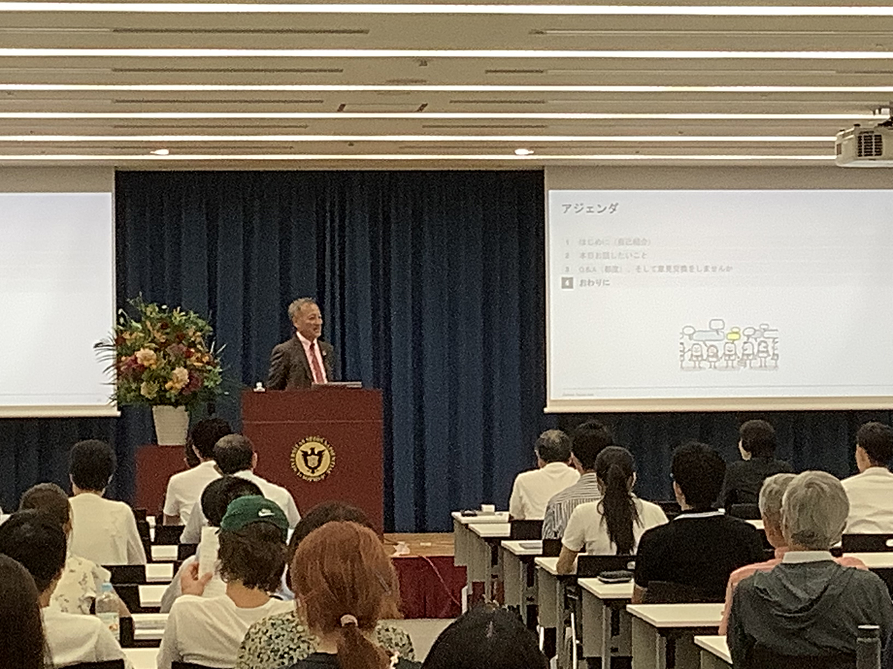 7月17日、三菱ふそうトラック・バス株式会社副社長の林春樹さん(1980外英)による講演会が行われました。当日、2号館1702教室は100名を超す参加者であふれ、とりわけ現役学生や卒業後間もないソフィアンなど若い方が半分を占めたのも印象的でした。