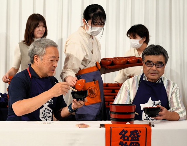 講演会の後は、全員での記念写真撮影を挟んで懇親会がスタート。地元のさんさ踊りが披露されたり、岩手のおもてなし料理わんこそばの早食い競争があったりと、会場は素晴らしい演出で盛り上がります。その後、グラスを傾けながらの和やかな懇親がしばし続きました。最後は、2年後の石川大会の告知を兼ねて石川ソフィア会会長の太田敏明さん(1981法法)からご挨拶があり、上原隆一さん(1976年経営)によるエール、全員で肩を組んでの校歌斉唱でお開きとなりました。