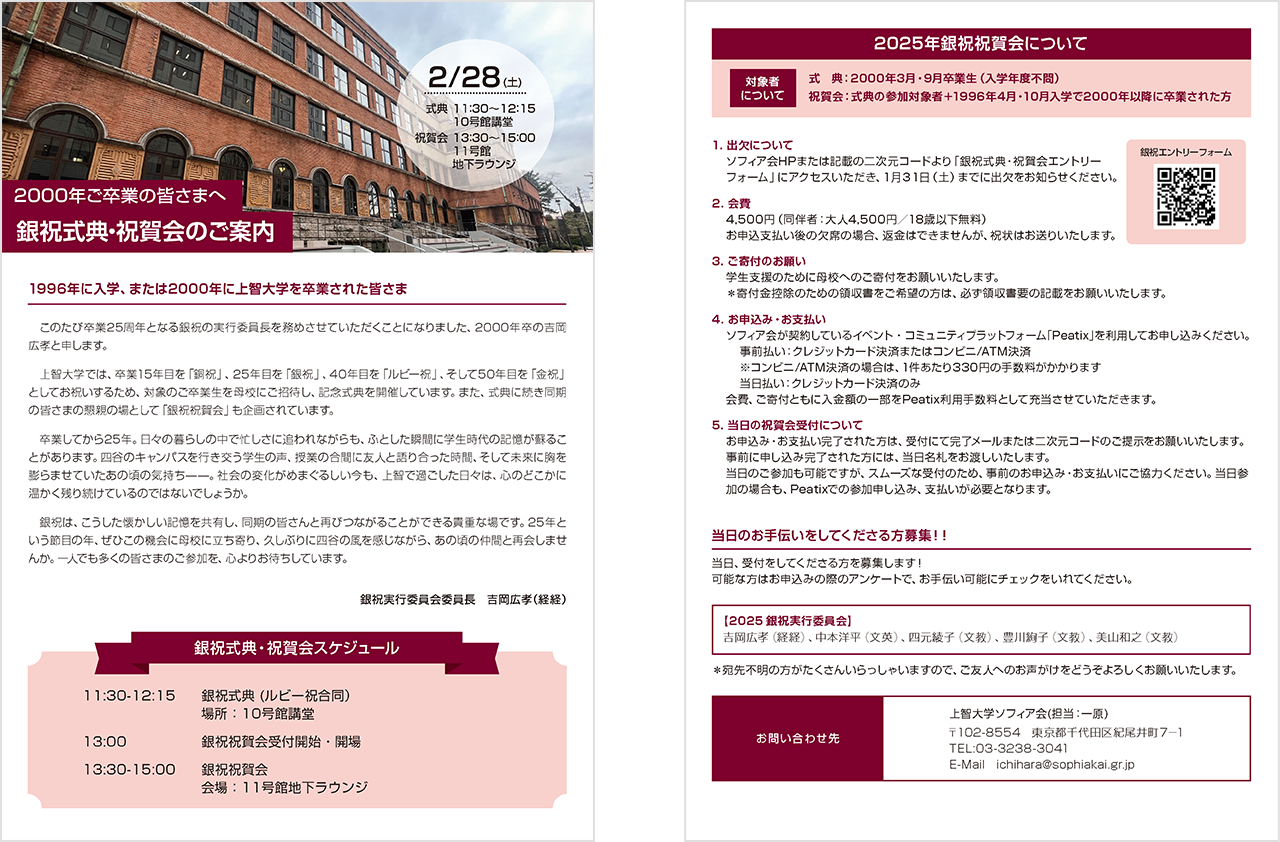 既にお知らせしております通り、2026年2月28日(土)、四谷キャンパスにて、卒業25周年銀祝の記念式典 及び 祝賀会が開催されます。懐かしいキャンパスにて、同級生やサークルのお仲間と久々の再会を楽しみませんか?