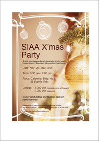 Sophia International Alumni Association invites you to Hybrid X'mas Party. We will have Salsa Dance and Michael Jackson Performance, and you can take this opportunity as your Bonenkai and Net-working. Graduates, professors and students are invited. Non-SIAA members are also welcome! Please come and enjoy our hybrid party!!