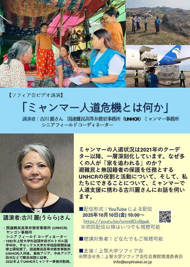 社会貢献推進委員会ビデオ講演 「ミャンマー人道危機とは何か」配信中! 2025年10月16日 一層深刻化するミャンマーの人道状況について、避難民と無国籍者の保護を任務とするUNHCRの役割と活動について、ミャンマーで人道支援に携わる古川麗さん(1992年外・ポル語卒)にお話を伺いました。 その講演を配信中です。 配信はこちらより 社会貢献推進委員会 佐藤光利(1979経営) Tweet シェアする お知らせ 2025年度 2024年度 2023年度 2022年度 2021年度 2020年度 2019年度 2018年度 2017年度 2016年度 2015年度 2014年度 2013年度 2012年度 2011年度 2010年度 2009年度
