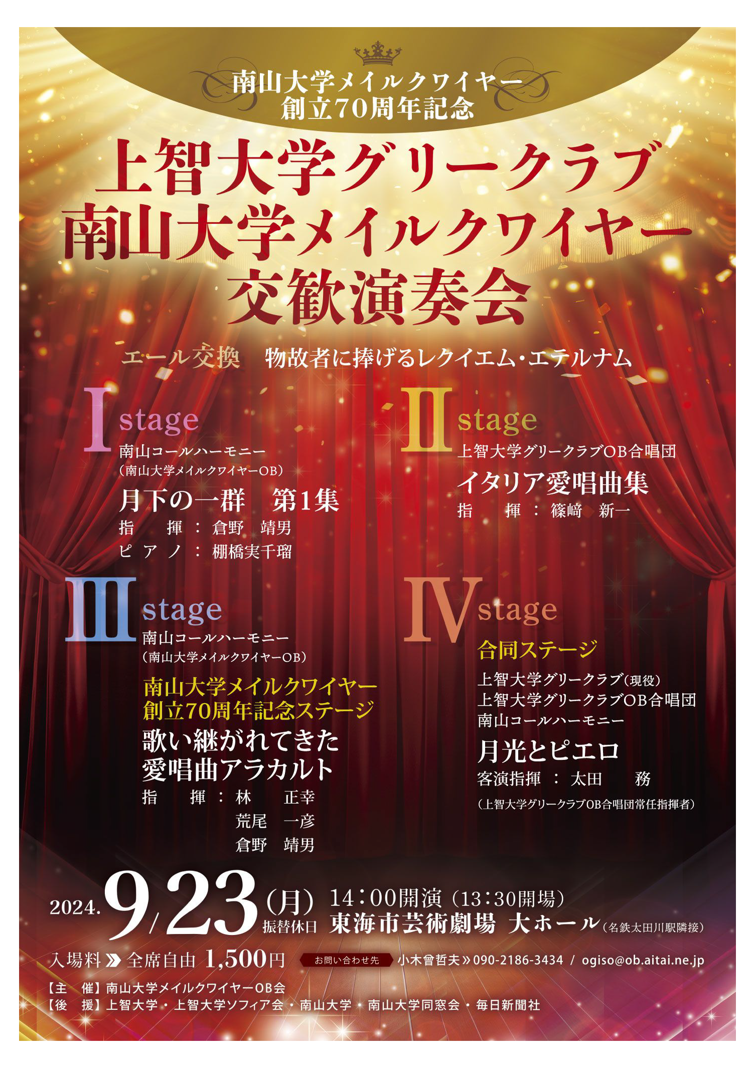 上智大学グリークラブは2023年に創部70周年を迎えました。当団と同じく創部70年を迎えた南山大学メイルクワイヤーのOBと6年ぶりに名古屋で上南交歓演奏会を下記内容にて開催いたします。チケットご希望の方におかれましては、上智側の事務局である金子(メールアドレスは下記に記載)までご連絡下さい。