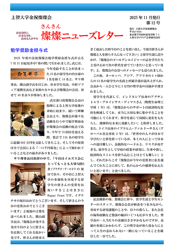 会員向けの手作りニューズレターも発行しており、最新の第12号では、燦燦会が掲げる留学生支援のメインイベント「金祝勉学奨励金授与式」の様子を報告しました。当日はサリ理事長にもご参加いただき、奨励金を授与された15名の留学生による感謝の言葉を掲載しています。奨励金は学費や研究費に充てられるほか、日本文化の体験や生活費としても有効に活用されている様子が伝わってきます。