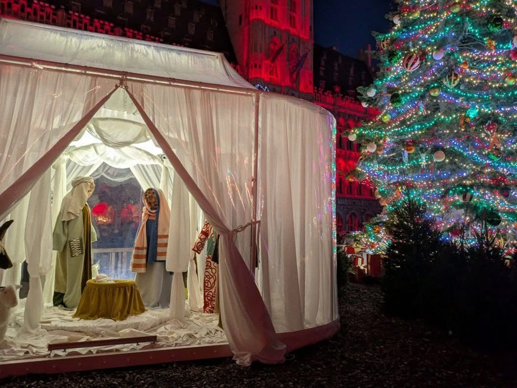 Afterwards, we headed into the old city-center through the characteristically Belgian misty drizzle and made our way to the Grand-Place, where we admired the large fir tree adorned with Christmas decorations and the nativity scene. We had heard that this year's nativity scene would focus less on Christian symbolism and feature a more modern, design-oriented style--but the reviews were lukewarm...